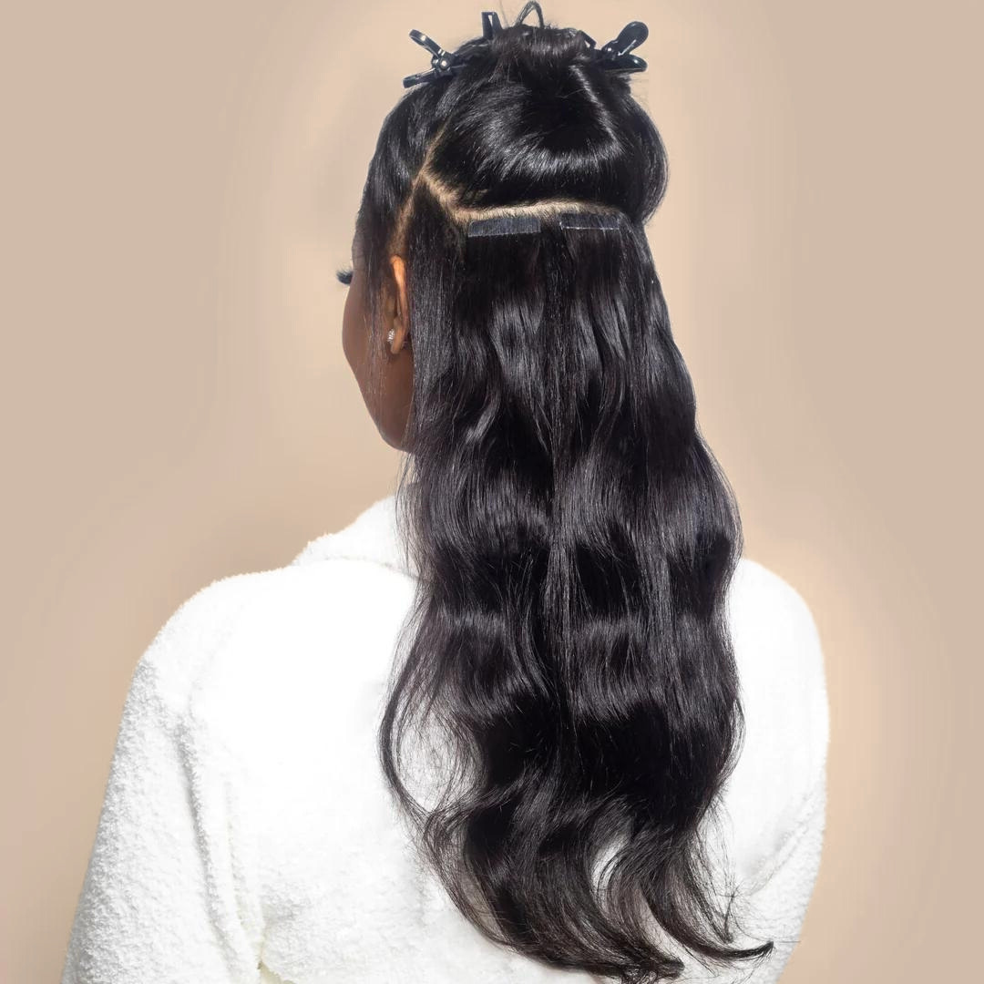 Les extensions "tape-in" sont une méthode d'ajout de longueur et de volume aux cheveux naturels en utilisant de fines bandes de cheveux artificiels ou naturels qui sont fixées près du cuir chevelu à l'aide d'un ruban adhésif double face. Voici quelques caractéristiques principales des extensions tape-in :